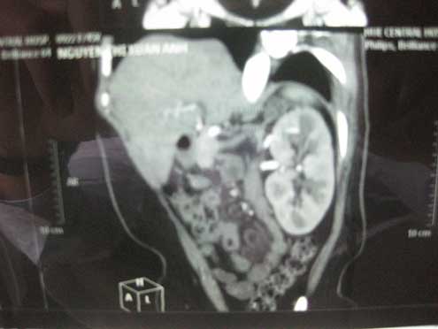 Bệnh nhân được chuyển mổ ngày 19/11/2009 cắt bỏ u thượng thận với đường kính 3x2x1,5cm khối u có vỏ bọc màu vàng dể vở.