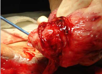 - Khối u lớn thoát ra ngoài thành bụng ở vết mổ đường giữa trên xương mu, nước tiểu dò ra xung quanh u.