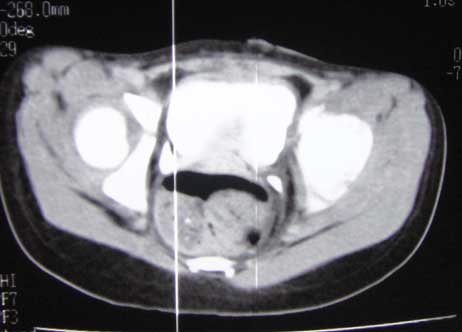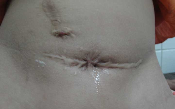- Sẹo xấu vùng hạ vị do lần phẫu thuật trước. Lỗ dò bàng quang qua vị trí dẫn lưu bàng quang trước đây. Nước tiểu tràn liên tục gây khó chịu cho bệnh nhân.